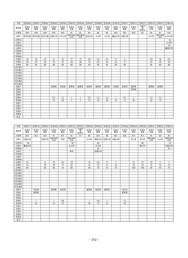 구분 인계100 인계101 인계102 인계103 인계104 인계105 인계106 인계107 인계108 인계109 인계110 인계111 인계112 인계113 인계114 인계115 인계116 중분류 조경수 활엽 조경수 활엽 조경수 활엽 조경수 활엽 조경수 활엽 조경수 침엽 조경수 침엽 조경수 침엽 조경수 침엽 조경수 침엽 조경수 활엽 조경수 활엽 조경수 관목 시설지 및 포장지 조경수 침엽 조경수 침엽 조경수 활엽 소분류 B34 B34 B34 B23 B16 B1 B1 B4 B6 B6 B35 B23 B39 D2 B6 B1 B19 교목1 중국단풍 중국단풍 중국단풍 단풍나무 느티나무 메타세콰 이어 메타세콰 이어 섬잣나무 소나무 소나무 튤립나무 단풍나무 소나무 메타세콰 이어 느티나무 교목1% 50 교목2 소나무 교목2%...