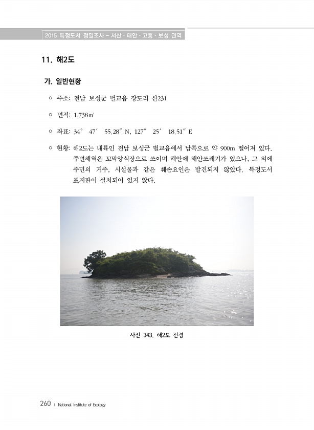 2015 특정도서 정밀조사 서산·태안·고흥·보성 권역 260 ? National Institute of Ecology 11. 해2도 가. 일반현황 ? 주소전남 보성군 벌교읍 장도리 산231 ? 면적1,738㎡ ? 좌표34° 47′ 55.28″N, 127° 25′ 18.51″E ? 현황해2도는 내륙인 전남 보성군 벌교읍에서 남쪽으로 약 900m 떨어져 있다. 주변해역은 꼬막양식장으로 쓰이며 해안에 해안쓰레기가 있으나, 그 외에 주민의 거주, 시설물과 같은 훼손요인은 발견되지 않았다. 특정도서 표지판이 설치되어 있지 않다. 사진 343. 해2도전경