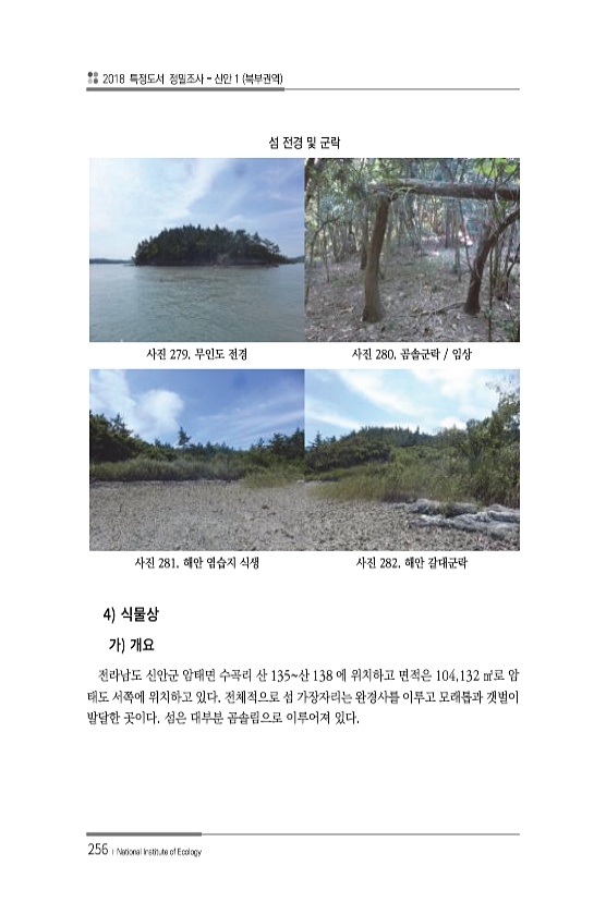 2018 특정도서 정밀조사 신안 1 북부권역 256 ? National Institute of Ecology 섬 전경 및 군락 사진 279. 무인도 전경 사진 280. 곰솔군락 임상 사진 281. 해안 염습지 식생 사진 282. 해안 갈대군락 4 전라남도 신안군 암태면 수곡리 산 135산 138 에 위치하고 면적은 104,132 ㎡로 암 태도 서쪽에 위치하고 있다. 전체적으로 섬 가장자리는 완경사를 이루고 모래톱과 갯벌이 발달한 곳이다. 섬은 대부분 곰솔림으로 이루어져있다.