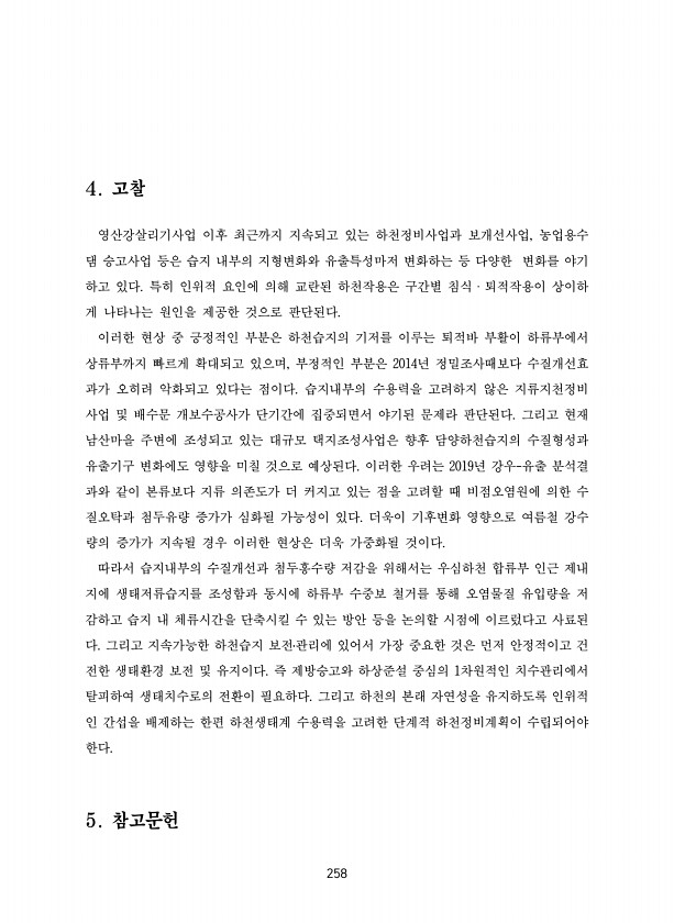 258 4. 고찰 영산강살리기사업 이후 최근까지 지속되고 있는 하천정비사업과 보개선사업, 농업용수 댐 승고사업 등은 습지 내부의 지형변화와 유출특성마저 변화하는 등 다양한 변화를 야기 하고 있다. 특히 인위적 요인에 의해 교란된 하천작용은 구간별 침식ㆍ퇴적작용이 상이하 게 나타나는 원인을 제공한 것으로 판단된다. 이러한 현상 중 긍정적인 부분은 하천습지의 기저를 이루는 퇴적바 부활이 하류부에서 상류부까지 빠르게 확대되고 있으며, 부정적인 부분은 2014년 정밀조사때보다 수질개선효 과가 오히려 악화되고 있다는 점이다. 습지내부의 수용력을 고려하지 않은 지류지천정비 사업 및 배수문 개보수공사가 단기간에 집중되면서 야기된 문제라 판단된다. 그리고 현재 남산마을 주변에 조성되고 있는 대규모 택지조성사업은 향후 담양...