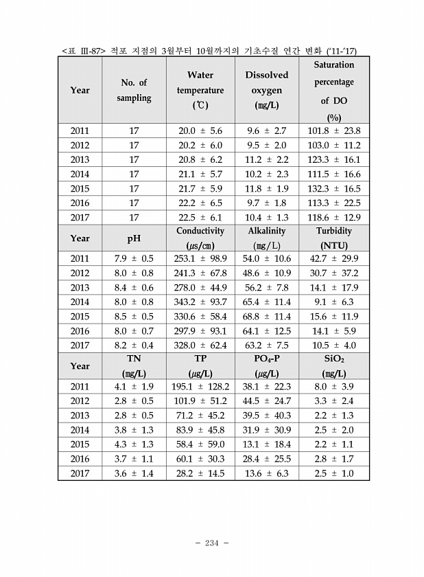 234 표 Ⅲ-87 적포 지점의 3월부터 10월까지의 기초수질 연간 변화 ‘11-’17 Year No. of sampling Water temperature ℃ Dissolved oxygen ㎎/L Saturation percentage of DO % 2011 17 20.0 ± 5.6 9.6 ± 2.7 101.8 ± 23.8 2012 17 20.2 ± 6.0 9.5 ± 2.0 103.0 ± 11.2 2013 17 20.8 ± 6.2 11.2 ± 2.2 123.3 ± 16.1 2014 17 21.1 ± 5.7 10.2 ± 2.3 111.5 ± 16.6 2015 17 21.7 ± 5.9 11.8 ± 1.9 132.3 ± 16.5 2016 17 22.2 ± 6.5 9.7 ± 1.8 113.3 ± 22.5 2017...
