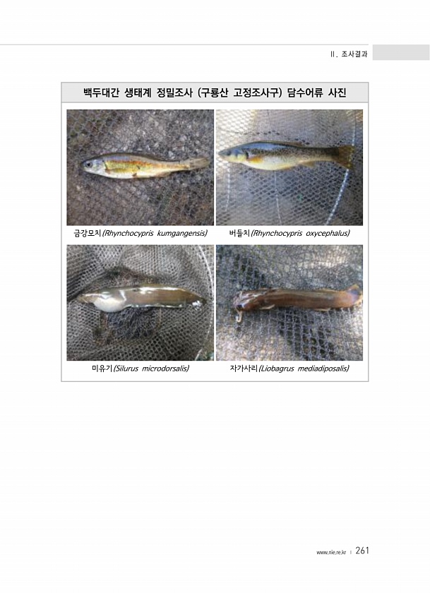 Ⅱ. 조사결과 www.nie.re.kr ? 261 백두대간 생태계 정밀조사 구룡산 고정조사구 담수어류 사진 금강모치 Rhynchocypris kumgangensis 버들치 Rhynchocypris oxycephalus 미유기 Silurus microdorsalis 자가사리 Liobagrus mediadiposalis