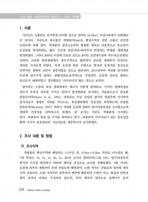 2015 생태·경관보전지역 정밀조사 거금도 적대봉 258 ? National Institute of Ecology 1. 서론 거금도는 고흥반도 남서쪽에 위치한 섬으로 면적은 63.6km2, 우리나라에서 10번째로 큰 섬이다. 거금도의 최고봉인 적대봉 593m 은 행정구역상 전남 고흥군 금산면 오천리에 속해 있다. 적대봉의 정상으로부터 발원한 계곡은 남동쪽으로 흐르면서 오천천을 형성하였고, 짧은 구간에 산림-하천-바다까지 연결되는 특별한 생태계를 형성하였다. 그러나 2005년 이전에 건설된 것으로 보이는 오천정수장과 저수지 오천제 로 인하여, 고유한 하천생태계가 정수구역으로 변하면서 중요한 생태축이 단절되는 결과를 가져오게 되었다. 특히 오천제 하류 주변으로 형성된 농경지를 중심으로 인위적인 생태적 교란이 집...
