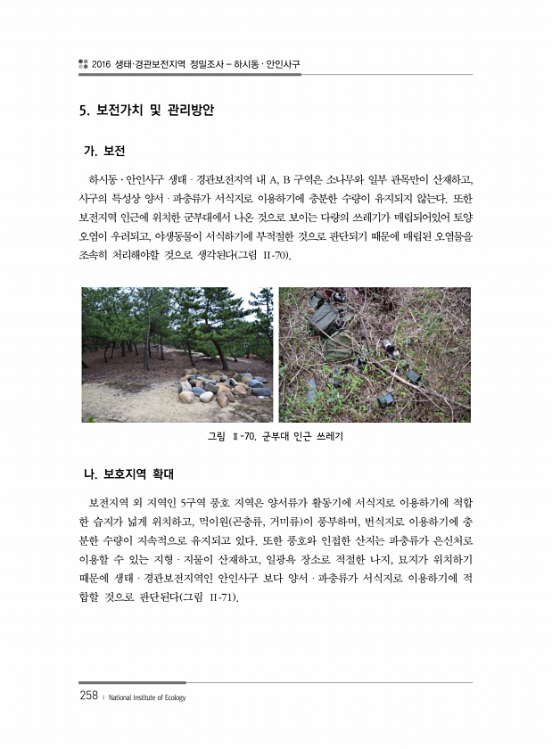 2016 생태·경관보전지역 정밀조사 하시동 · 안인사구 258 ? National Institute of Ecology 5. 보전가치 및 관리방안 가. 보전 하시동·안인사구 생태ㆍ경관보전지역 내 A, B 구역은 소나무와 일부 관목만이 산재하고, 사구의 특성상 양서ㆍ파충류가 서식지로 이용하기에 충분한 수량이 유지되지 않는다. 또한 보전지역 인근에 위치한 군부대에서 나온 것으로 보이는 다량의 쓰레기가 매립되어있어 토양 오염이 우려되고, 야생동물이 서식하기에 부적절한 것으로 판단되기 때문에 매립된 오염물을 조속히 처리해야할 것으로 생각된다 그림 Ⅱ-70 그림 Ⅱ-70. 군부대 인근 쓰레기 나. 보호지역 확대 보전지역 외 지역인 5구역 풍호 지역은 양서류가 활동기에 서식지로 이용하기에 적합 한 습지가 넓게 위치하고...