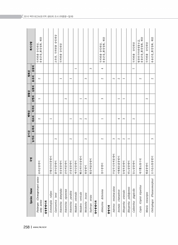 2016 백두대간보호지역 생태계 조사 추풍령밀재 258Ⅰwww.nie.re.kr Species Name 국명 웅이산 백학산 봉황산 청화산 특이사항 능치리 웅북리 대포리 덕곡리 상현리 심봉리 용유리 삼송리 Phelotrupes Chromogeotrupes auratus subsp. auratus 보라금풍뎅이 2 1 2 국유외용반곤출충_승환인경대정상화,, 해충 검정풍뎅이과 Ectinohoplia rufipes 주황긴다리풍뎅이 1 Gastroserica herzi 줄우단풍뎅이 2 고유종, 국외반출 승인대상 Holotrichia diomphalia 참검정풍뎅이 1 국외반출 승인대상 Holotrichia niponensis 큰다색풍뎅이 2 Holotrichia parallela 큰검정풍뎅이 2 1 1 Maladera...