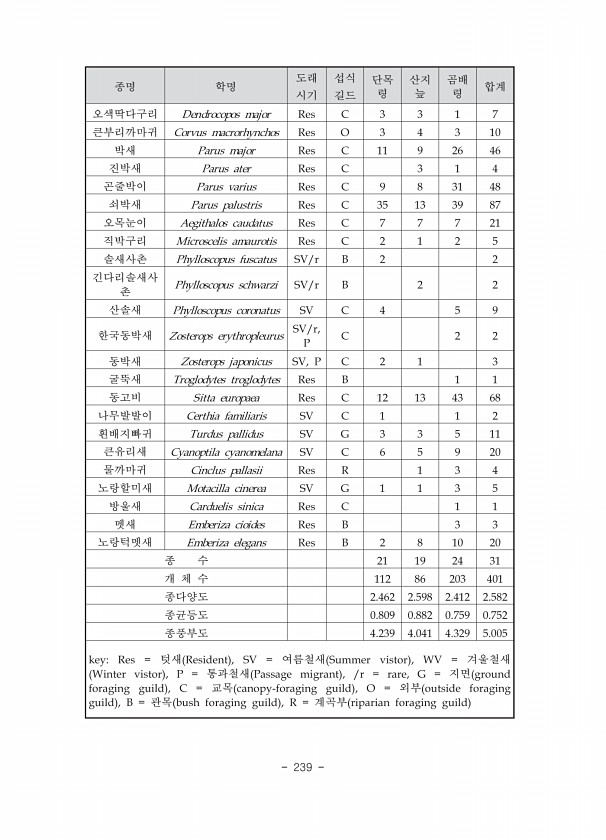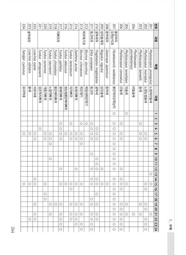 Ⅴ. 부록 244 번호 과명 학명 국명 1 2 3 4 5 6 7 8 9 10 11 12 13 14 15 16 17 18 19 20 21 22 23 24 201 Phylloscopus proregulus 노랑허리솔새 ○ ○ ○ 202 Phylloscopus inornatus 노랑눈썹솔새 ○ ○ ○ ○ ○ ○ ○ ○ ○ 203 Phylloscopus borealis 솔새 ○ ○ ○ ○ ○ 204 Phylloscopus plumbeitarsus 버들솔새 ○ 205 Phylloscopus tenellipes 되솔새 ○ ○ ○ ○ 206 Phylloscopus coronatus 산솔새 ○ ○ ○ ○ ○ ○ ○ ○ ○ ○ ○ ○ ○ 207 붉은머리 오목눈이과 Paradoxornis webbianus 붉은머리오목눈이 ○...