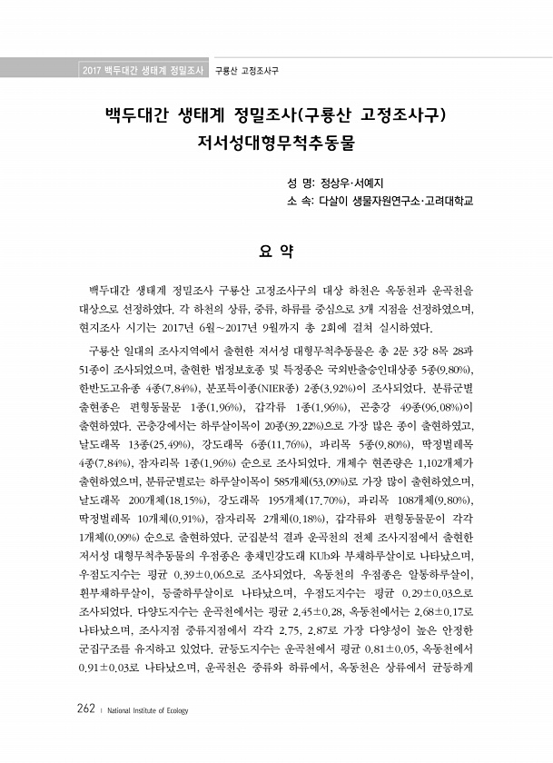 2017 백두대간 생태계 정밀조사 구룡산 고정조사구 262 ? National Institute of Ecology 백두대간 생태계 정밀조사 구룡산 고정조사구 저서성대형무척추동물 성 명정상우·서예지 소 속다살이 생물자원연구소·고려대학교 요 약 백두대간 생태계 정밀조사 구룡산 고정조사구의 대상 하천은 옥동천과 운곡천을 대상으로 선정하였다. 각 하천의 상류, 중류, 하류를 중심으로 3개 지점을 선정하였으며, 현지조사 시기는 2017년 6월∼2017년 9월까지 총 2회에 걸쳐 실시하였다. 구룡산 일대의 조사지역에서 출현한 저서성 대형무척추동물은 총 2문 3강 8목 28과 51종이 조사되었으며, 출현한 법정보호종 및 특정종은 국외반출승인대상종 5종 9.80% , 한반도고유종 4종 7.84% , 분포특이종 NIER종...