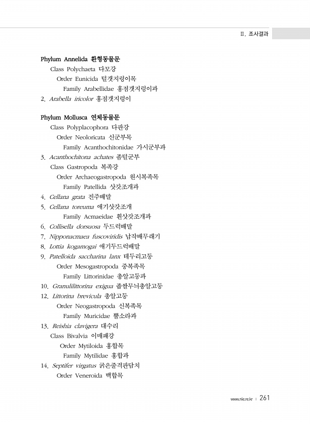 Ⅱ. 조사결과 www.nie.re.kr ? 261 Phylum Annelida 환형동물문 Class Polychaeta 다모강 Order Eunicida 털갯지렁이목 Family Arabellidae 홍점갯지렁이과 2. Arabella iricolor 홍점갯지렁이 Phylum Mollusca 연체동물문 Class Polyplacophora 다판강 Order Neoloricata 신군부목 Family Acanthochitonidae 가시군부과 3. Acanthochitona achates 좀털군부 Class Gastropoda 복족강 Order Archaeogastropoda 원시복족목 Family Patellida 삿갓조개과 4. Cellana grata 진주배말 5. Cellana toreuma 애기삿갓조...