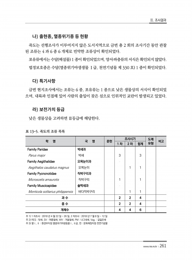II. 조사결과 www.nie.re.kr ?261 , 죽도는 선행조사가 이루어지지 않은 도서지역으로 금번 총 2 회의 조사기간 동안 관찰 된 조류는 4 과 6 종 6 개체로 빈약한 조류상이 확인되었다. 포유류에서는 수달 배설물 1 종이 확인되었으며, 양서?파충류의 서식은 확인되지 않았다. 법정보호종은 수달 멸종위기야생생물 Ⅰ급, 천연기념물 제 330 호 1 종이 확인되었다. 금번 현지조사에서는 조류는 6 종, 포유류는 1 종으로 낮은 생물상의 서식이 확인되었 으며, 내륙과 인접해 있어 사람의 출입이 잦은 섬으로 인위적인 교란이 발생되고 있었다. 낮은 생물상을 고려하면 Ⅱ등급에 해당한다. 학 명 국 명 문헌 조사시기 도래 1 차 2 차 합계 유형 비고 Family Paridae 박새과 Parus major 박...