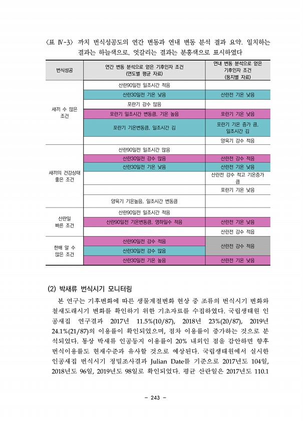 243 번식성공 연간 변동 분석으로 얻은 기후인자 조건 연도별 평균 자료 연내 변동 분석으로 얻은 기후인자 조건 둥지별 자료 새끼 수 많은 조건 산란90일전 일조시간 적음 산란30일전 기온 낮음 산란전 기온 낮음 포란기 강수 많음 포란기 일조시간 변동큼, 기온 높음 포란기 기온 낮음 포란기 기온변동큼, 일조시간 김 포란기 기온 증가 큼, 일조시간 김 양육기 강수 적음 새끼의 건강상태 좋은 조건 산란90일전 일조시간 많음 산란30일전 강수 많음 산란전 강수 적음 산란30일전 기온 낮음 산란전 기온 낮음 산란전 강수 적고 기온증가 큼 포란기 기온 낮음 양육기 기온높음, 일조시간 변동큼 산란일 빠른 조건 산란90일전 일조시간 적음 산란90일전 기온변동큼, 영하일수 적음 산란전 기온 낮음 산란전 강수 적음 한배 알...