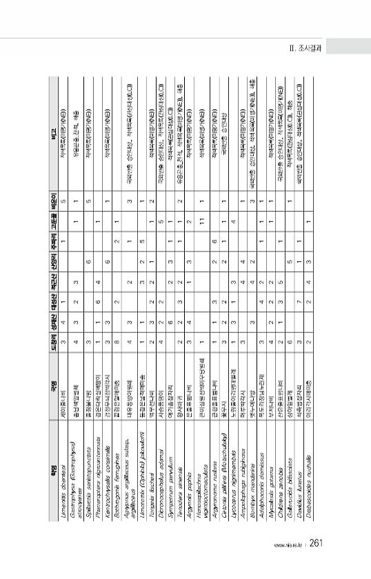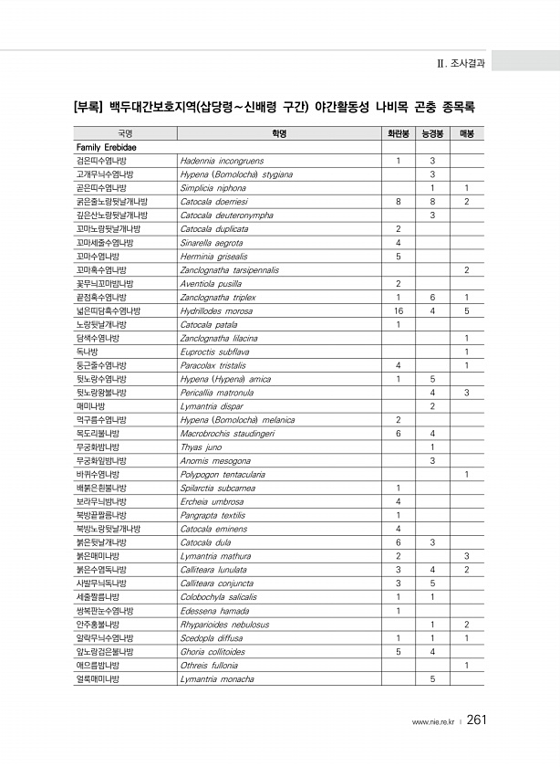 Ⅱ. 조사결과 www.nie.re.kr ? 261 국명 학명 화란봉 능경봉 매봉 Family Erebidae 검은띠수염나방 Hadennia incongruens 1 3 고개무늬수염나방 Hypena Bomolocha stygiana 3 곧은띠수염나방 Simplicia niphona 1 1 굵은줄노랑뒷날개나방 Catocala doerriesi 8 8 2 깊은산노랑뒷날개나방 Catocala deuteronympha 3 꼬마노랑뒷날개나방 Catocala duplicata 2 꼬마세줄수염나방 Sinarella aegrota 4 꼬마수염나방 Herminia grisealis 5 꼬마혹수염나방 Zanclognatha tarsipennalis 2 꽃무늬꼬마밤나방 Aventiola pusilla 2 끝점혹수염나방 Zancl...
