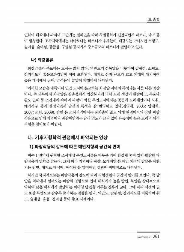 III. 종 합 www.nie.re.kr ?261 인하여 해식애나 파식대 표면에는 절리면을 따라 차별풍화가 진전되면서 타포니, 나마 등 이 형성된다. 조사지역에서는 나마보다는 타포니가 우세한데, 대규모는 아니지만 소평도, 솔거섬, 술대섬, 둥글섬, 구멍섬 등지에서 중소규모의 타포니가 발달하고 있다. 화강암류가 분포하는 도서는 많지 않다. 역만도의 섬록암을 비롯하여 갈퀴섬, 소평도, 장거리도의 흑운모화강암이 이에 포함된다. 대체로 산지 규모가 크고 외해에 위치하여 높은 해식애나 급애, 암석돔의 발달이 탁월하게 나타난다. 이러한 모습은 내륙이나 연안 도서에 분포하는 화강암 지대의 특성과는 사뭇 다른 양상 이다. 즉 내륙에서 화강암은 심층풍화시 입상붕괴에 의한 모래 생성이 활발하고, 목포나 완도 근해 등 조간대에...
