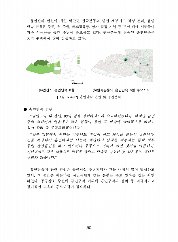 흡연관리 민원이 제일 많았던 원곡본동의 민원 세부지도 작성 결과, 흡연 단속 민원은 주로, 역 주변, 버스정류장, 상가 밀집 지역 등 도심 내에 시민들이 자주 이용하는 공간 주변에 분포하고 있다. 원곡본동에 집중된 흡연단속은 00역 주변에서 많이 발생하고 있다. a 안산시 흡연단속 8월 b 원곡본동의 흡연단속 8월 수요지도 [그림 Ⅳ-4-22] 흡연단속 민원 및 공간분석 ● 흡연단속 민원“금연구역 내 흡연. 00역 앞을 정비하시느라 수고하셨습니다. 하지만 금연 구역 스티커가 있음에도 많은 분들이 흡연 후 바닥에 담배꽁초를 버리고 있어 관리 좀 부탁드리겠습니다.” “양쪽 계단에서 흡연을 너무나도 버젓이 하고 계시는 분들이 많습니다. 건물 옥상에서 흡연하시면 되는데 계단에서 담배를 피우시는 통에 하루 종일 간접...