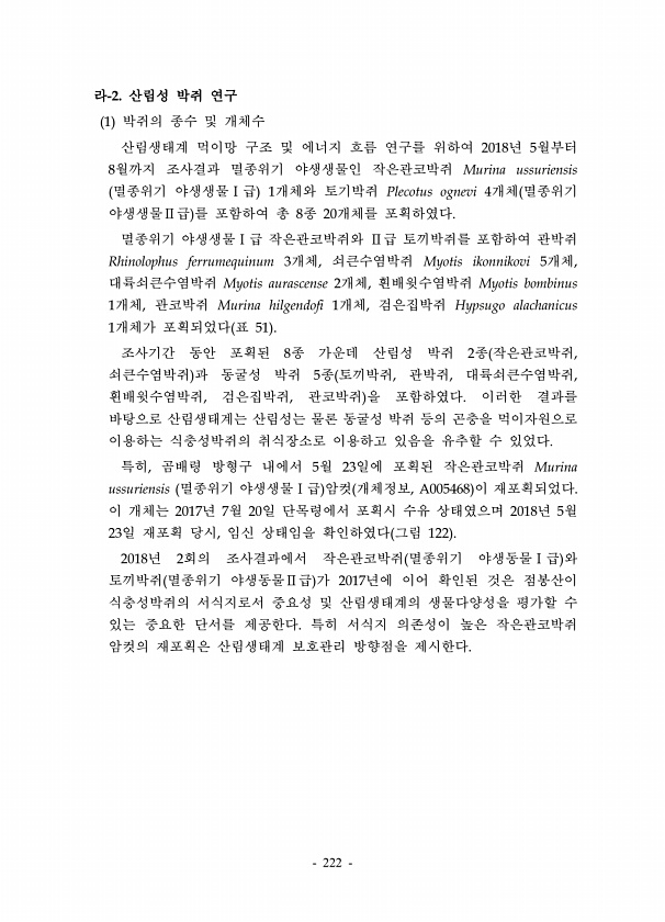 222 라-2. 산림성 박쥐 연구 1 박쥐의 종수 및 개체수 산림생태계 먹이망 구조 및 에너지 흐름 연구를 위하여 2018년 5월부터 8월까지 조사결과 멸종위기 야생생물인 작은관코박쥐 Murina ussuriensis 멸종위기 야생생물Ⅰ급 1개체와 토기박쥐 Plecotus ognevi 4개체 멸종위기 야생생물Ⅱ급 를 포함하여 총 8종 20개체를 포획하였다. 멸종위기 야생생물Ⅰ급 작은관코박쥐와 Ⅱ급 토끼박쥐를 포함하여 관박쥐 Rhinolophus ferrumequinum 3개체, 쇠큰수염박쥐 Myotis ikonnikovi 5개체, 대륙쇠큰수염박쥐 Myotis aurascense 2개체, 흰배윗수염박쥐 Myotis bombinus 1개체, 관코박쥐 Murina hilgendofi 1개체, 검은집박쥐 Hypsu...