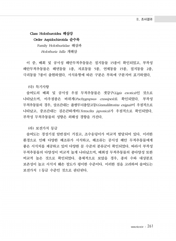 Ⅱ. 조사결과 www.nie.re.kr ? 261 Class Holothuroidea 해삼강 Order Aspidochirotida 순수목 Family Holothuriidae 해삼과 Holothuria hilla 개해삼 이 중, 배회 및 공서성 해안무척추동물은 절지동물 15종이 확인되었고, 부착성 해안무척추동물은 해면동물 1종, 자포동물 5종, 연체동물 15종, 절지동물 2종, 극피동물 7종이 출현하였다. 서식유형에 따른 구분은 부록에 구분지어 표기하였다. 다 특기사항 솔여도의 배회 및 공서성 우점 무척추동물은 갯강구 Ligia exotica 인 것으로 나타났으며, 아우점종은 바위게 Pachygrapsus crassipes 로 확인되었다. 부착성 무척추동물의 경우, 상조간대는 좁쌀무늬총알고둥 Granuli...