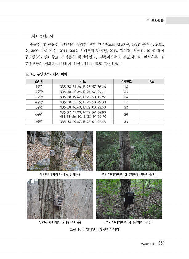 Ⅱ. 조사결과 www.nie.re.kr ? 259 나 문헌조사 운문산 및 운문산 일대에서 실시한 선행 연구자료를 참고 전, 1992; 손과김, 2001, 오, 2009; 박희천 등, 2011, 2012; 김의경과 방기정, 2013; 김의경, 허남진, 2014 하여 구간별 격자별 주요 서식종을 확인하였고, 멸종위기종의 분포지역과 번식유무 및 포유류상의 변화를 파악하기 위한 기초 자료로 활용하였다. 조사지 좌표 격자번호 비고 1구간 N35 38 34.26, E128 57 36.26 18 2구간 N35 38 56.24, E128 57 25.71 25 3구간 N35 38 49.67, E128 58 15.97 26 4구간 N35 38 32.15, E128 58 49.38 27 5구간 N35 38 16.40, E129...