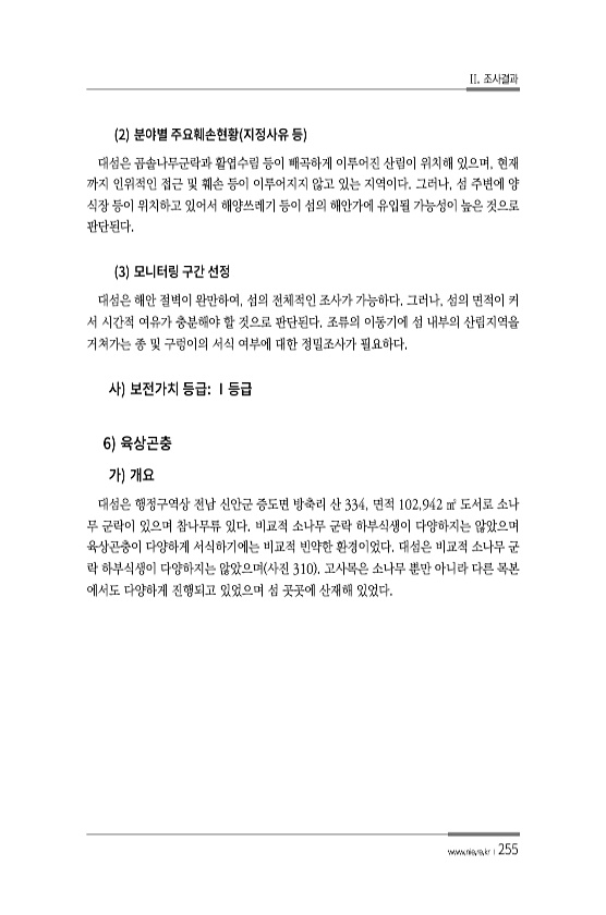 II. 조사결과 www.nie.re.kr ?255 2 대섬은 곰솔나무군락과 활엽수림 등이 빼곡하게 이루어진 산림이 위치해 있으며, 현재 까지 인위적인 접근 및 훼손 등이 이루어지지 않고 있는 지역이다. 그러나, 섬 주변에 양 식장 등이 위치하고 있어서 해양쓰레기 등이 섬의 해안가에 유입될 가능성이 높은 것으로 판단된다. 3 대섬은 해안 절벽이 완만하여, 섬의 전체적인 조사가 가능하다. 그러나, 섬의 면적이 커 서 시간적 여유가 충분해야 할 것으로 판단된다. 조류의 이동기에 섬 내부의 산림지역을 거쳐가는 종 및 구렁이의 서식 여부에 대한 정밀조사가 필요하다. 6 대섬은 행정구역상 전남 신안군 증도면 방축리 산 334, 면적 102,942 ㎡ 도서로 소나 무 군락이 있으며 참나무류 있다. 비교적 소나무 군락 하...