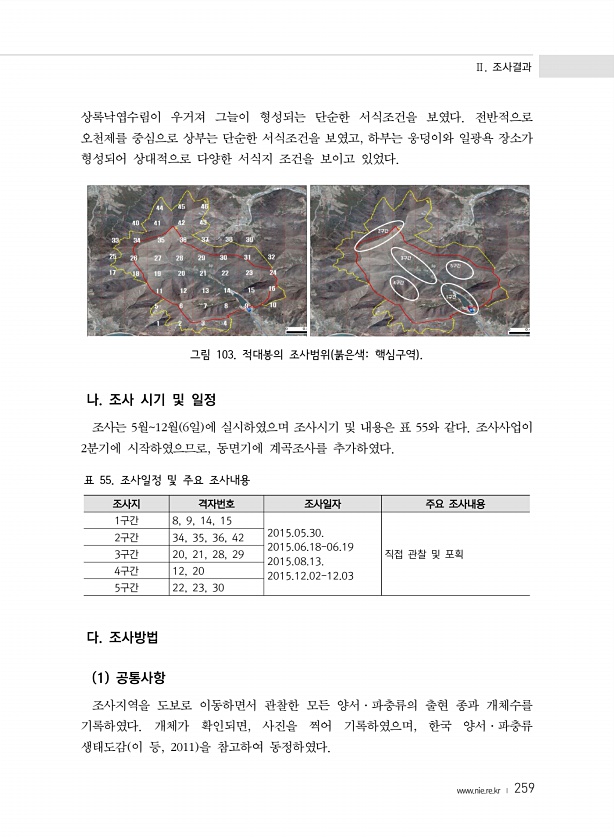 Ⅱ. 조사결과 www.nie.re.kr ? 259 상록낙엽수림이 우거져 그늘이 형성되는 단순한 서식조건을 보였다. 전반적으로 오천제를 중심으로 상부는 단순한 서식조건을 보였고, 하부는 웅덩이와 일광욕 장소가 형성되어 상대적으로 다양한 서식지 조건을 보이고 있었다. 그림 103. 적대봉의 조사범위 붉은색핵심구역 나. 조사 시기 및 일정 조사는 5월12월 6일 에 실시하였으며 조사시기 및 내용은 표 55와 같다. 조사사업이 2분기에 시작하였으므로, 동면기에 계곡조사를 추가하였다. 조사지 격자번호 조사일자 주요 조사내용 1구간 8, 9, 14, 15 2015.05.30. 2015.06.18-06.19 2015.08.13. 2015.12.02-12.03 직접 관찰 및 포획 2구간 34, 35, 36, 42 3구간 ...