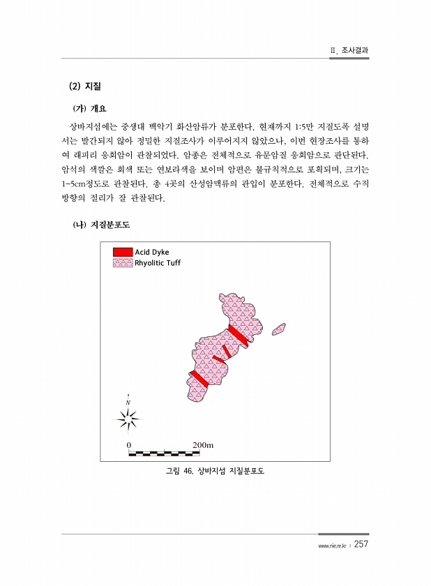 Ⅱ. 조사결과 www.nie.re.kr ? 257 2 지질 가 개요 상바지섬에는 중생대 백악기 화산암류가 분포한다. 현재까지 15만 지질도폭 설명 서는 발간되지 않아 정밀한 지질조사가 이루어지지 않았으나, 이번 현장조사를 통하 여 래피리 응회암이 관찰되었다. 암종은 전체적으로 유문암질 응회암으로 판단된다. 암석의 색깔은 회색 또는 연보라색을 보이며 암편은 불규칙적으로 포획되며, 크기는 15cm정도로 관찰된다. 총 4곳의 산성암맥류의 관입이 분포한다. 전체적으로 수직 방향의 절리가 잘 관찰된다. 나 지질분포도 그림 46. 상바지섬지질분포도