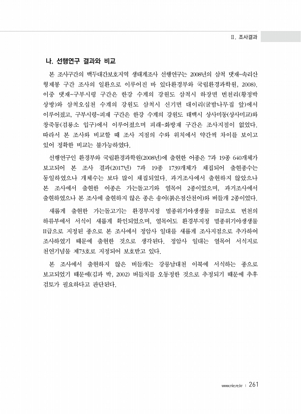 Ⅱ. 조사결과 www.nie.re.kr ? 261 나. 선행연구 결과와 비교 본 조사구간의 백두대간보호지역 생태계조사 선행연구는 2008년의 삼척 댓재속리산 형제봉 구간 조사의 일환으로 이루어진 바 있다환경부와 국립환경과학원, 2008 이중 댓재구부시령 구간은 한강 수계의 강원도 삼척시 하장면 번천리 황정박 상방 와 삼척오십천 수계의 강원도 삼척시 신기면 대이리 굴밤나무집 앞 에서 이루어졌고, 구부시령피재 구간은 한강 수계의 강원도 태백시 상사미동 상사미교 와 창죽동 검룡소 입구 에서 이루어졌으며 피래화방재 구간은 조사지점이 없었다. 따라서 본 조사와 비교할 때 조사 지점의 수와 위치에서 약간씩 차이를 보이고 있어 정확한 비교는 불가능하였다. 선행연구인 환경부와 국립환경과학원 2008년 에 출현한 어종은 7...