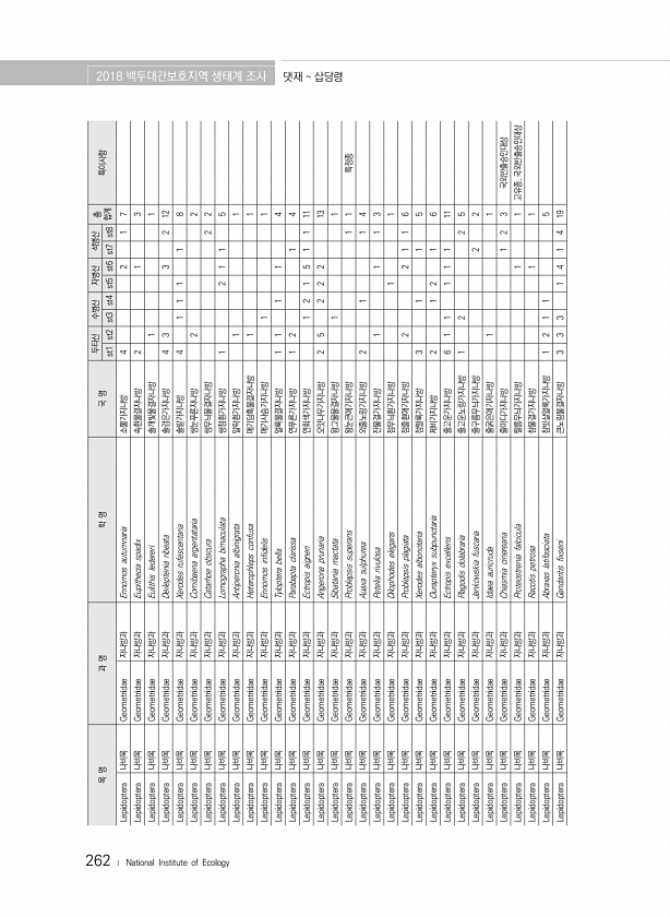 262 ? National Institute of Ecology 목 명 과 명 학 명 국 명 두타산 수병산 자병산 석병산 총 st1 st2 st3 st4 st5 st6 st7 st8 합계 특이사항 Lepidoptera 나비목 Geometridae 자나방과 Ennomos autumnaria 소뿔가지나방 4 2 1 7 Lepidoptera 나비목 Geometridae 자나방과 Eupithecia spadix 속흰물결자나방 2 1 3 Lepidoptera 나비목 Geometridae 자나방과 Eulithis ledereri 솔개빛물결자나방 1 1 Lepidoptera 나비목 Geometridae 자나방과 Deileptenia ribeata 솔검은가지나방 4 3 3 2 12 Lepidoptera 나비목 Geomet...