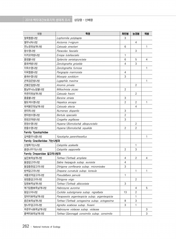 2018 백두대간보호지역 생태계 조사 삽당령 신배령 262 ? National Institute of Ecology 국명 학명 화란봉 능경봉 매봉 얼룩짤름나방 Lophomilia polybapta 3 엘무늬독나방 Arctornis l-nigrum 4 연노랑뒷날개나방 Catocala streckeri 6 1 왕수염나방 Paracolax fascialis 3 이끼꼬마밤나방 Enispa lutefascialis 1 줄점불나방 Spilarctia seriatopunctata 6 5 4 줄회색밤나방 Zanclognatha griselda 4 3 지옥수염나방 Zanclognatha fumosa 1 지옥짤름나방 Pangrapta marmorata 4 총채수염나방 Mosopia sordidum 3 큰목검은밤나방 Lygep...