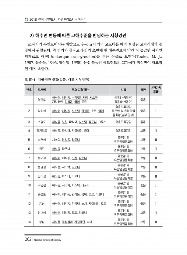 2018 전국 무인도서 자연환경조사 여수 1 262 ? National Institute of Ecology 2 조사지역 무인도에서는 해발고도 4∼6m 내외의 고도대를 따라 형성된 고파식대가 곳 곳에서 관찰된다. 즉 빙기가 끝나고 후빙기 초반에 현 해수면보다 약간 더 높았던 시기인 덩케르크 해진 Dunkerque transgression 을 겪은 산물로 보인다 Tooley, M. J., 1987; 윤순옥, 1996; 황상일, 1998 용섬 북동안 헤드랜드의 고파식대 침식면이 대표적 인 예에 속한다. 번호 도서명 주요 지형경관 지질 경관 보전가치 등급 1 역만도 해식애, 해식동, 수직절리지형, 시스택, 자갈해안, 암석돔, 급애, 토르 섬록암 중북부 장동층 남동단 좋음 Ⅰ 2 갈퀴섬 해식애, 해식동, 시스택, ...
