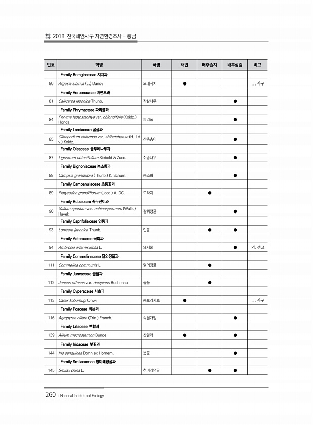 2018 전국해안사구 자연환경조사 충남 260 ? National Institute of Ecology 번호 학명 국명 해빈 배후습지 배후삼림 비고 Family Boraginaceae 지치과 80 Argusia sibirica L. Dandy 모래지치 ● Ⅰ, 사구 Family Verbenaceae 마편초과 81 Callicarpa japonica Thunb. 작살나무 ● Family Phrymaceae 파리풀과 84 Phryma leptostachya var. oblongifolia Koidz. Honda 파리풀 ● Family Lamiaceae 꿀풀과 85 Clinopodium chinense var. shibetchense H. Le? v. Koidz. 산층층이 ● Family Oleaceae 물푸레나...
