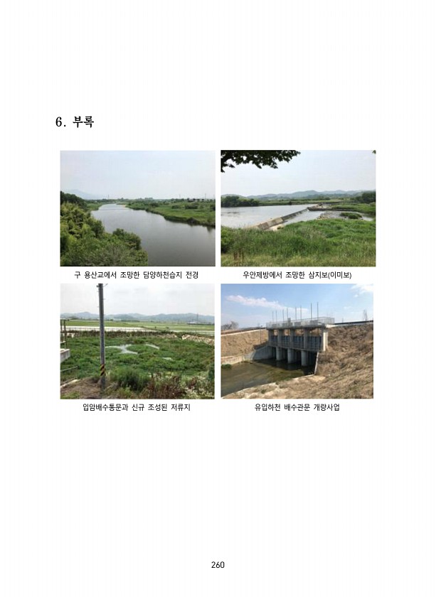 260 6. 부록 구 용산교에서 조망한 담양하천습지 전경 우안제방에서 조망한 삼지보 이미보 입암배수통문과 신규 조성된 저류지 유입하천 배수관문개량사업
