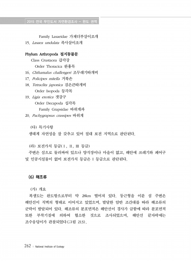 2015 전국 무인도서 자연환경조사 완도 권역 262 ? National Institute of Ecology Family Lasaeidae 가재더부살이조개 15. Lasaea undulata 족사살이조개 Phylum Arthropoda 절지동물문 Class Crustacea 갑각강 Order Thoracica 완흉목 16. Chthamalus challengeri 조무래기따개비 17. Policipes mitella 거북손 18. Tetraclita japonica 검은큰따개비 Order Isopoda 등각목 19. Ligia exotica 갯강구 Order Decapoda 십각목 Family Grapsidae 바위게과 20. Pachygrapsus crassipes 바위게 다 특기사항 생태계 자연성을 잘...