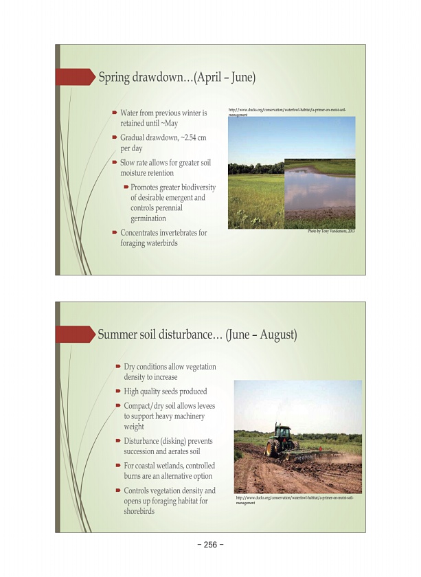 Summer soil disturbance… June ? August ? Dry conditions allow vegetation density to increase ? High quality seeds produced ? Compact/dry soil allows levees to support heavy machinery weight ? Disturbance disking prevents succession and aerates soil ? For coastal wetlands, controlled burns are an alternative option ? Controls vegetation density and opens up foraging habitat for shorebirds http//www...