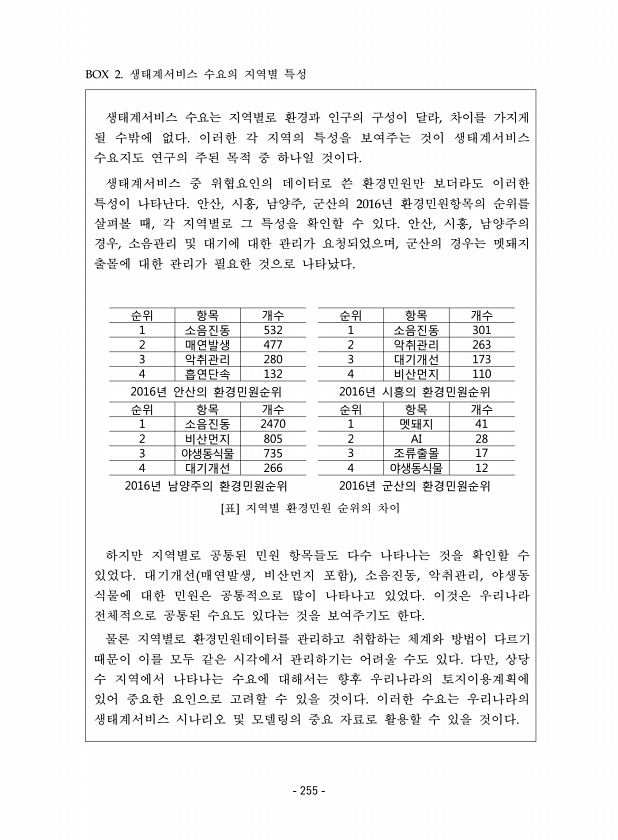 생태계서비스 수요는 지역별로 환경과 인구의 구성이 달라, 차이를 가지게 될 수밖에 없다. 이러한 각 지역의 특성을 보여주는 것이 생태계서비스 수요지도 연구의 주된 목적 중 하나일 것이다. 생태계서비스 중 위협요인의 데이터로 쓴 환경민원만 보더라도 이러한 특성이 나타난다. 안산, 시흥, 남양주, 군산의 2016년 환경민원항목의 순위를 살펴볼 때, 각 지역별로 그 특성을 확인할 수 있다. 안산, 시흥, 남양주의 경우, 소음관리 및 대기에 대한 관리가 요청되었으며, 군산의 경우는 멧돼지 출몰에 대한 관리가 필요한 것으로 나타났다. 순위 항목 개수 1 소음진동 532 2 매연발생 477 3 악취관리 280 4 흡연단속 132 순위 항목 개수 1 소음진동 301 2 악취관리 263 3 대기개선 173 4 비산먼지 1...