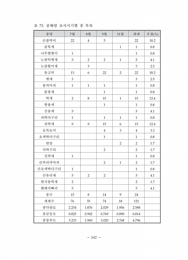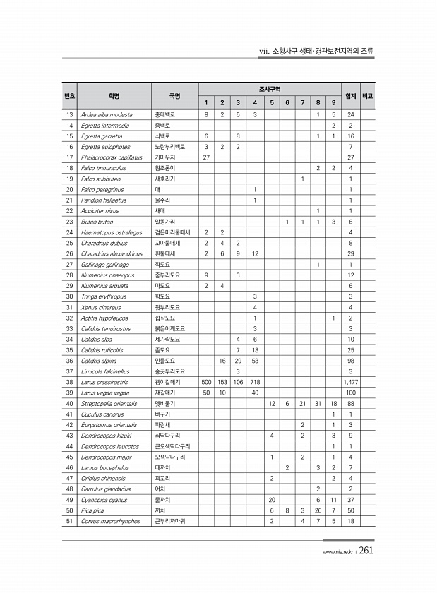 vii. 소황사구 생태·경관보전지역의 조류 www.nie.re.kr ?261 번호 학명 국명 조사구역 합계 비고 1 2 3 4 5 6 7 8 9 13 Ardea alba modesta 중대백로 8 2 5 3 1 5 24 14 Egretta intermedia 중백로 2 2 15 Egretta garzetta 쇠백로 6 8 1 1 16 16 Egretta eulophotes 노랑부리백로 3 2 2 7 17 Phalacrocorax capillatus 가마우지 27 27 18 Falco tinnunculus 황조롱이 2 2 4 19 Falco subbuteo 새호리기 1 1 20 Falco peregrinus 매 1 1 21 Pandion haliaetus 물수리 1 1 22 Accipiter nisus 새매 ...