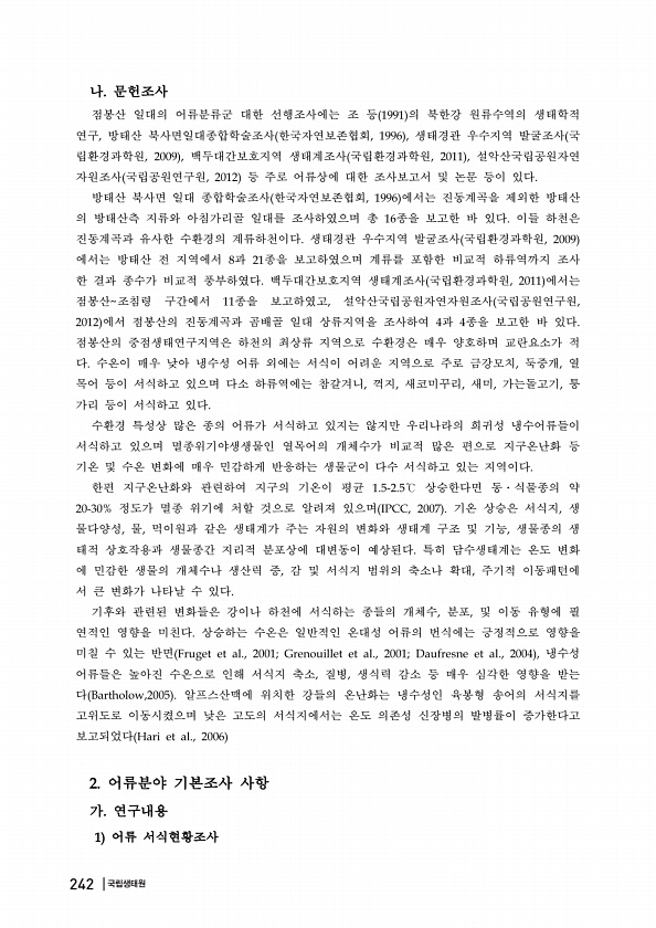 나 문헌조사 점봉산 일대의 어류분류군 대한 선행조사에는 조 등 의 북한강 원류수역의 생태학적 연구 방태산 북사면일대종합학술조사 한국자연보존협회 생태경관 우수지역 발굴조사 국 립환경과학원 백두대간보호지역 생태계조사 국립환경과학원 설악산국립공원자연 자원조사 국립공원연구원 등 주로 어류상에 대한 조사보고서 및 논문 등이 있다 방태산 북사면 일대 종합학술조사 한국자연보존협회 에서는 진동계곡을 제외한 방태산 의 방태산측 지류와 아침가리골 일대를 조사하였으며 총 종을 보고한 바 있다 이들 하천은 진동계곡과 유사한 수환경의 계류하천이다 생태경관 우수지역 발굴조사 국립환경과학원 에서는 방태산 전 지역에서 과 종을 보고하였으며 계류를 포함한 비교적 하류역까지 조사 한 결과 종수가 비교적 풍부하였다 백두대간보호지역 생태계조사...