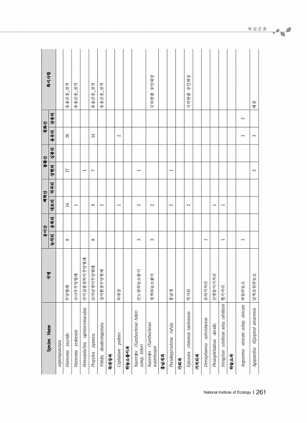 육 상 곤 충 National Institute of EcologyⅠ261 Species Name 국명 웅이산 백학산 봉황산 청화산 특이사항 능치리 웅북리 대포리 덕곡리 상현리 심봉리 용유리 삼송리 septempunctata Harmonia axyridis 무당벌레 8 14 17 26 유용곤충_천적 Harmonia yedoensis 소나무무당벌레 1 유용곤충_천적 Henosepilachna vigintioctomaculata 큰이십팔점박이무당벌레 1 Propylea japonica 꼬마남생이무당벌레 8 9 7 14 유용곤충_천적 Vibidia duodecimguttata 십이흰점무당벌레 2 유용곤충_천적 목대장과 Cephaloon pallens 목대장 1 2 하늘소붙이과 Nacerdes Xanthochroa...