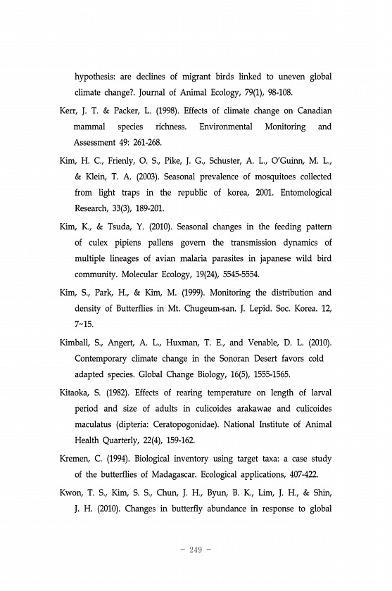 Ⅱ. 조사결과 www.nie.re.kr ? 261 참고문헌 Arthur W. White and Graham H. Pyke. 2008. Green and Golden Bell Frogs in New South Walescurrent status and future prospects. Australian Zollogist bolume 34 3 319-333. DECC, 2007. Management Plan for the Green and Golden Bell Frog Key Population at Kurnell. Department of Environment and Climate Change DECC , NSW, Sydney. Tanaka A., 2010. Novel biodiversity offset st...