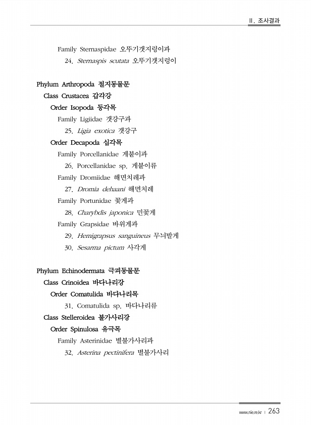 Ⅱ. 조사결과 www.nie.re.kr ? 263 Family Sternaspidae 오뚜기갯지렁이과 24. Sternaspis scutata 오뚜기갯지렁이 Phylum Arthropoda 절지동물문 Class Crustacea 갑각강 Order Isopoda 등각목 Family Ligiidae 갯강구과 25. Ligia exotica 갯강구 Order Decapoda 십각목 Family Porcellanidae 게붙이과 26. Porcellanidae sp. 게붙이류 Family Dromiidae 해면치레과 27. Dromia dehaani 해면치레 Family Portunidae 꽃게과 28. Charybdis japonica 민꽃게 Family Grapsidae 바위게과 29. Hemigrapsus s...