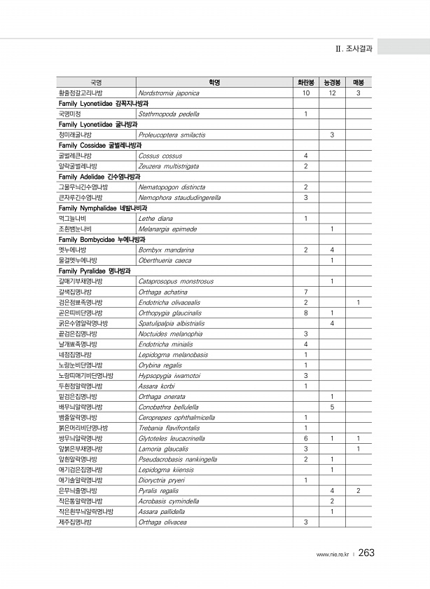 Ⅱ. 조사결과 www.nie.re.kr ? 263 국명 학명 화란봉 능경봉 매봉 황줄점갈고리나방 Nordstromia japonica 10 12 3 Family Lyonetiidae 감꼭지나방과 국명미정 Stathmopoda pedella 1 Family Lyonetiidae 굴나방과 청미래굴나방 Proleucoptera smilactis 3 Family Cossidae 굴벌레나방과 굴벌레큰나방 Cossus cossus 4 알락굴벌레나방 Zeuzera multistrigata 2 Family Adelidae 긴수염나방과 그물무늬긴수염나방 Nematopogon distincta 2 큰자루긴수염나방 Nemophora staududingerella 3 Family Nymphalidae 네발나비과 먹그늘나비 Let...