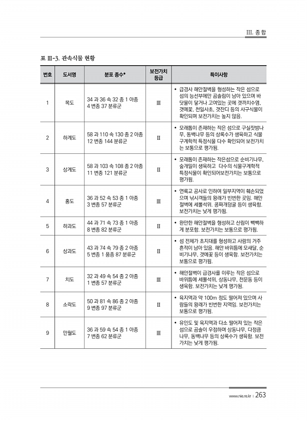 III. 종 합 www.nie.re.kr ?263 번호 도서명 분포 종수* 보전가치 등급 특이사항 1 목도 34 과 36 속 32 종 1 아종 4 변종 37 분류군 Ⅲ ? 급경사 해안절벽을 형성하는 작은 섬으로 섬의 능선부에만 곰솔림이 남아 있으며 바 닷물이 닿거나 고여있는 곳에 갯까치수염, 갯메꽃, 천일사초, 갯잔디 등의 사구식물이 확인되며 보전가치는 높지 않음. 2 하계도 58 과 110 속 130 종 2 아종 12 변종 144 분류군 Ⅱ ? 모래톱이 존재하는 작은 섬으로 구실잣밤나 무, 동백나무 등의 상록수가 생육하고 식물 구계학적 특정식물 다수 확인되어 보전가치 는 보통으로 평가됨. 3 상계도 58 과 103 속 108 종 2 아종 11 변종 121 분류군 Ⅱ ? 모래톱이 존재하는 작은섬으로 순비기나...
