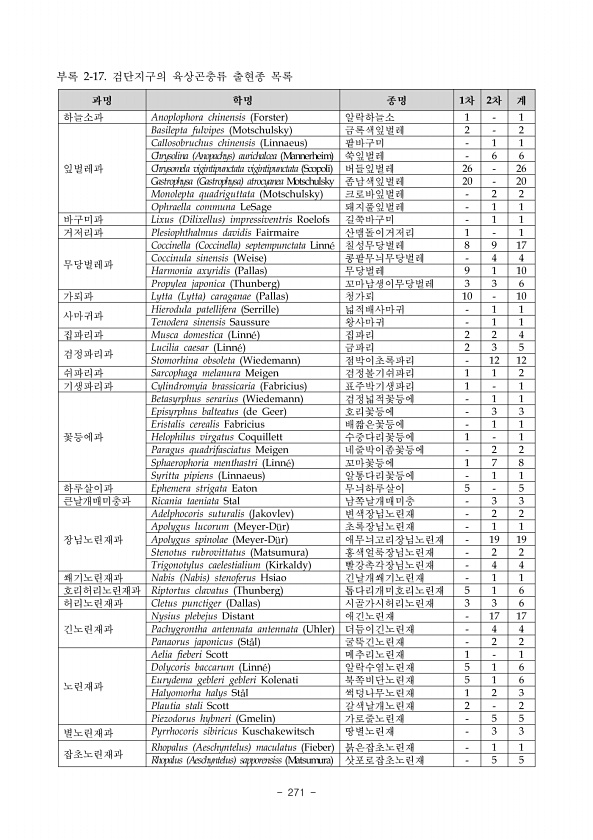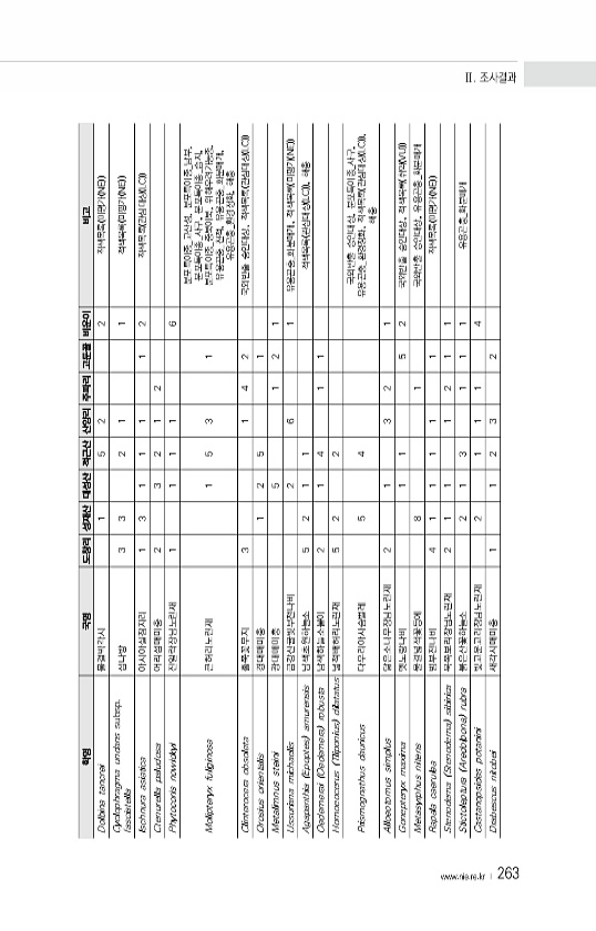 www ·nie·re·kr ? 263 학명 국명 도창리 성재산 대성산 적근산 산양리 주파리 고둔골 비운이 비고 Dolbina tancrei 물결박각시 1 5 2 2 적색목록 미평가 NE Cyclophragma undans subsp. fasciatella 섭나방 3 3 2 1 1 적색목록 미평가 NE Ischnura asiatica 아시아실잠자리 1 3 1 1 1 1 2 적색목록 관심대상 LC Ctenurella paludosa 어리섬매미충 2 3 2 1 2 Phytocoris nowickyi 진알락장님노린재 1 1 1 1 6 Molipteryx fuliginosa 큰허리노린재 1 5 3 1 분포특이종_고산성, 분포특이종_남부, 분포특이종_사구, 분포특이종_습지, 분포특이종_중북이북, 위해우려가능종, 유용곤...