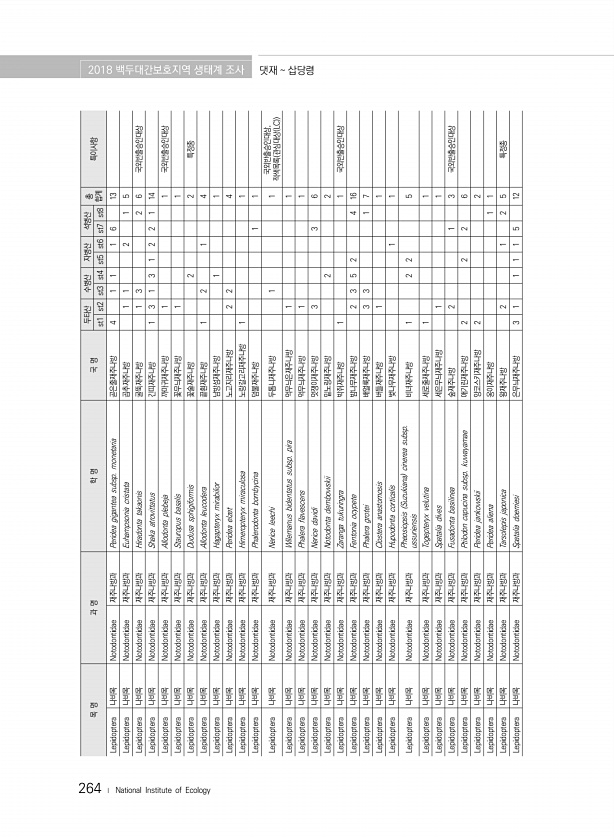 264 ? National Institute of Ecology 목 명 과 명 학 명 국 명 두타산 수병산 자병산 석병산 총 st1 st2 st3 st4 st5 st6 st7 st8 합계 특이사항 Lepidoptera 나비목 Notodontidae 재주나방과 Peridea gigantea subsp. monetaria 곧은줄재주나방 4 1 1 1 6 13 Lepidoptera 나비목 Notodontidae 재주나방과 Euhampsonia cristata 곱추재주나방 1 1 2 1 5 Lepidoptera 나비목 Notodontidae 재주나방과 Hiradonta takaonis 굴뚝재주나방 1 3 2 6 국외반출승인대상 Lepidoptera 나비목 Notodontidae 재주나방과 Shaka atrovitt...