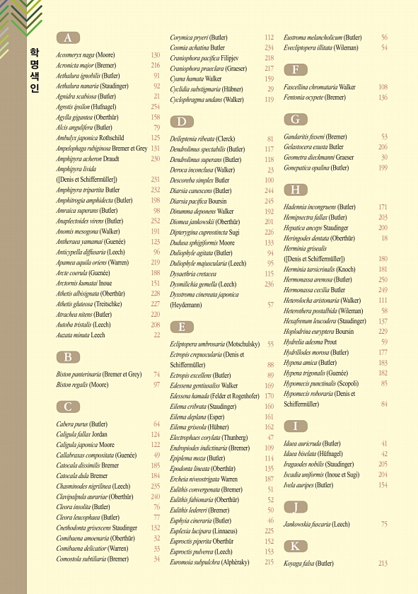 학명색인 A Acosmeryx naga Moore 130 Acronicta major Bremer 216 Aethalura ignobilis Butler 91 Aethalura nanaria Staudinger 92 Agnidra scabiosa Butler 21 Agrotis ipsilon Hufnagel 254 Agylla gigantea Oberth?r 158 Alcis angulifera Butler 79 Ambulyx japonica Rothschild 125 Ampelophaga rubiginosa Bremer et Grey 131 Amphipyra acheron Draudt 230 Amphipyra livida [Denis et Schifferm?ller] 231 Amphipyra tripart...