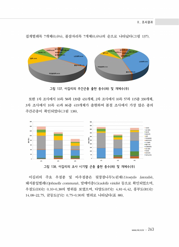 Ⅱ. 조사결과 www.nie.re.kr ? 263 집게벌레목 7개체 0.6% , 풀잠자리목 7개체 0.6% 의 순으로 나타났다 그림 137 그림 137. 이길리의 주간곤충 출현 종수 좌 및 개체수 우 또한 1차 조사에서 10목 58과 139종 431개체, 2차 조사에서 10목 57과 115종 330개체, 3차 조사에서 10목 41과 86종 419개체가 출현하여 봄철 조사에서 가장 많은 종의 주간곤충이 확인되었다 그림 138 그림 138. 이길리의 조사 시기별 곤충 출현 종수 좌 및 개체수 우 이길리의 주요 우점종 및 아우점종은 뒷창참나무노린재 Urostylis lateralis , 돼지풀잎벌레 Ophraella communa , 말매미충 Cicadella viridis 등으로 확인되었으며, 우점도 DI 는 ...