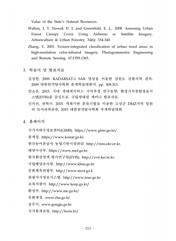 252 학술지 및 발표자료 김상완 영상을 이용한 강원도 산불지역 관측 대한원격탐사학회 춘계학술대회지 안소은 국내 생태계서비스 가치추정 연구동향 환경가치종합정보시 스템 을 중심으로 국립생태원 세미나 발표자료 신지선 권혁수 객체기반 분류기법을 이용한 고성군 지역 일원 의 토지피복분류 대한원격탐사학회 추계학술대회 홈페이지 국가지하수정보센터 통계청 한국농어촌공사 농업기반시설관리 해양수산부 한국환경정책 평가연구원 국립해양조사원 문화체육관광부 관광지식정보시스템 초록지팡이 환경부 문화재청 공주시국가통계포털