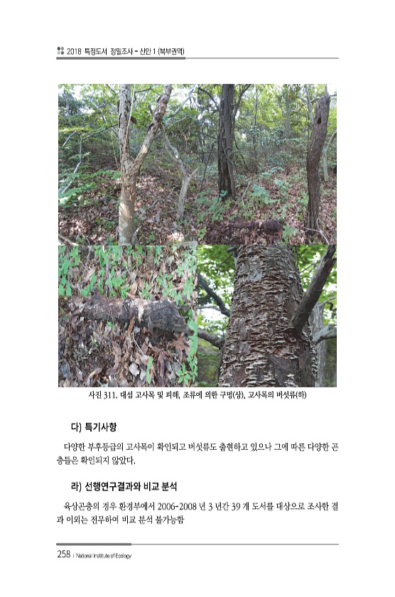 2018 특정도서 정밀조사 신안 1 북부권역 258 ? National Institute of Ecology 사진 311. 대섬 고사목 및 피해, 조류에 의한 구멍 상 , 고사목의 버섯류 하 다양한 부후등급의 고사목이 확인되고 버섯류도 출현하고 있으나 그에 따른 다양한 곤 충들은 확인되지 않았다. 육상곤충의 경우 환경부에서 2006-2008 년 3 년간 39 개 도서를 대상으로 조사한 결 과 이외는 전무하여 비교 분석불가능함