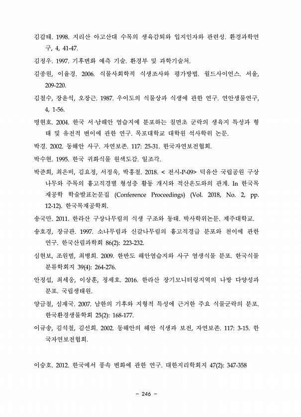 246 김갑태. 1998. 지리산 아고산대 수목의 생육감퇴와 입지인자와 관련성. 환경과학연 구, 4, 41-47. 김정우. 1997. 기후변화 예측 기술. 환경부 및 과학기술처. 김종원, 이율경. 2006. 식물사회학적 식생조사와 평가방법. 월드사이언스. 서울, 209-220. 김철수, 장윤석, 오장근. 1987. 우이도의 식물상과 식생에 관한 연구. 연안생물연구, 4, 1-56. 명현호. 2004. 한국 서·남해안 염습지에 분포하는 칠면초 군락의 생육지 특성과 형 태 및 유전적 변이에 관한 연구. 목포대학교 대학원 석사학위 논문. 박경. 2002. 동해안 사구. 자연보존. 11725-31. 한국자연보전협회. 박수현. 1995. 한국 귀화식물 원색도감. 일조각. 박준희, 최은비, 김요정, 서정욱, 박홍철. ...