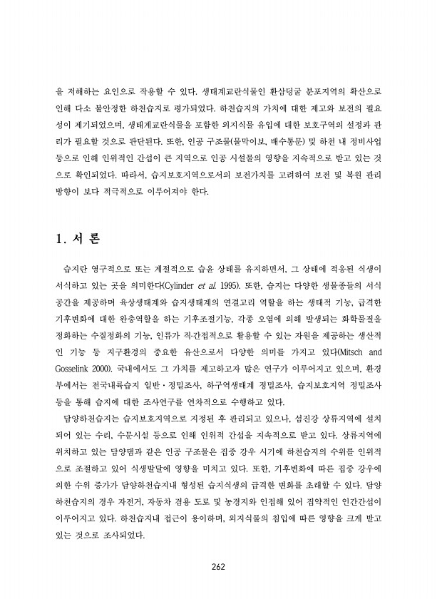 262 을 저해하는 요인으로 작용할 수 있다. 생태계교란식물인 환삼덩굴 분포지역의 확산으로 인해 다소 불안정한 하천습지로 평가되었다. 하천습지의 가치에 대한 제고와 보전의 필요 성이 제기되었으며, 생태계교란식물을 포함한 외지식물 유입에 대한 보호구역의 설정과 관 리가 필요할 것으로 판단된다. 또한, 인공 구조물 물막이보, 배수통문 및 하천 내 정비사업 등으로 인해 인위적인 간섭이 큰 지역으로 인공 시설물의 영향을 지속적으로 받고 있는 것 으로 확인되었다. 따라서, 습지보호지역으로서의 보전가치를 고려하여 보전 및 복원 관리 방향이 보다 적극적으로 이루어져야 한다. 1. 서 론 습지란 영구적으로 또는 계절적으로 습윤 상태를 유지하면서, 그 상태에 적응된 식생이 서식하고 있는 곳을 의미한다 Cylinder et ...