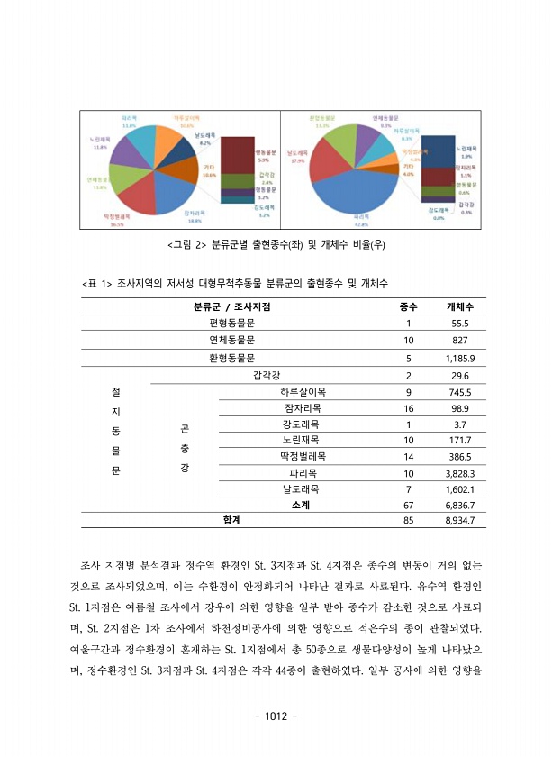 1012 그림 2 분류군별 출현종수 좌 및 개체수 비율 우 분류군 조사지점 종수 개체수 편형동물문 1 55.5 연체동물문 10 827 환형동물문 5 1,185.9 절 지 동 물 문 갑각강 2 29.6 곤 충 강 하루살이목 9 745.5 잠자리목 16 98.9 강도래목 1 3.7 노린재목 10 171.7 딱정벌레목 14 386.5 파리목 10 3,828.3 날도래목 7 1,602.1 소계 67 6,836.7 합계 85 8,934.7 표 1 조사지역의 저서성 대형무척추동물 분류군의 출현종수 및 개체수 조사 지점별 분석결과 정수역 환경인 St. 3지점과 St. 4지점은 종수의 변동이 거의 없는 것으로 조사되었으며, 이는 수환경이 안정화되어 나타난 결과로 사료된다. 유수역 환경인 St. 1지점은 여름철 조사에서 강...