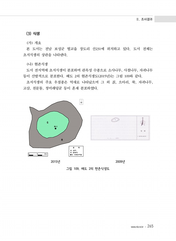 Ⅱ. 조사결과 www.nie.re.kr ? 265 3 식생 가 개요 본 도서는 전남 보성군 벌교읍 장도리 산231에 위치하고 있다. 도서 전체는 초지식생의 상관을 나타낸다. 나 현존식생 도서 전지역에 초지식생이 분포하며 관목성 수종으로 소사나무, 사철나무, 자귀나무 등이 산발적으로 분포한다. 해도 2의 현존식생도 2015년 는 그림 109와 같다. 초지식생의 주요 우점종은 억새로 나타났으며 그 외 칡, 으아리, 쑥, 자귀나무, 고삼, 천문동, 청미래덩굴 등이 혼재 분포하였다. 2015년 2009년 그림 109. 해도 2의현존식생도