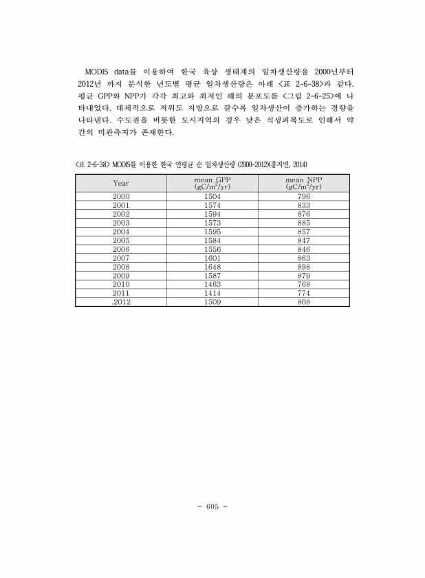605 MODIS data를 이용하여 한국 육상 생태계의 일차생산량을 2000년부터 2012년 까지 분석한 년도별 평균 일차생산량은 아래 표 2-6-38 과 같다. 평균 GPP와 NPP가 각각 최고와 최저인 해의 분포도를 그림 2-6-25 에 나 타내었다. 대체적으로 저위도 지방으로 갈수록 일차생산이 증가하는 경향을 나타낸다. 수도권을 비롯한 도시지역의 경우 낮은 식생피복도로 인해서 약 간의 미관측지가 존재한다. Year mean GPP gC/m2/yr mean NPP gC/m2/yr 2000 1504 796 2001 1574 833 2002 1594 876 2003 1573 885 2004 1595 857 2005 1584 847 2006 1556 846 2007 1601 863 2008 1648 898 ...